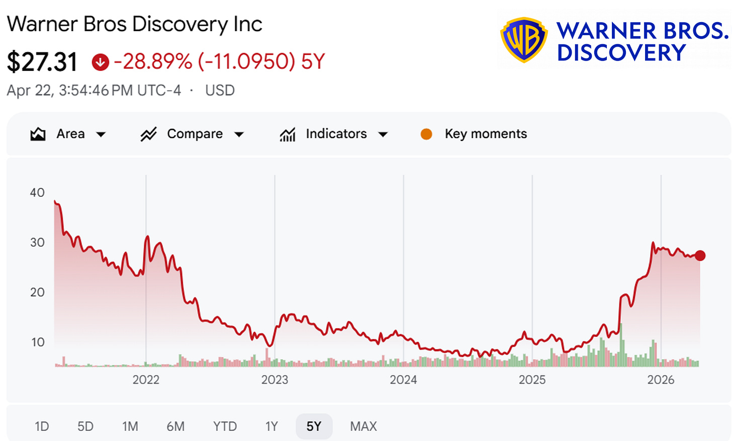 Let’s look at the actual tape. David Zaslav’s tenure at WBD was an objective failure by any real operational metric. The only saving grace of his run was that the stock jumped from $8 to $31 (deal price) after getting caught in the middle of a bidding war. One party, Paramount Skydance, was more than willing to overpay because they were buying the WBD asset as a political power move, not necessarily to make money.