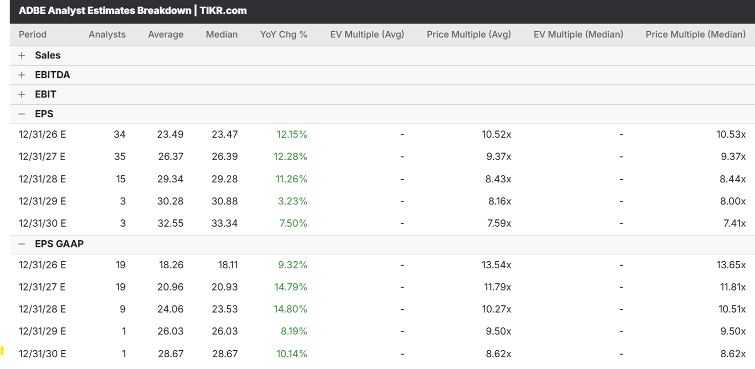I am not as impressed by the buyback as some other value investors because I fundamentally believe that financial engineering is not a strategy. I do not have faith that Adobe can both spark organic growth (note that consensus revenue estimates are forecasting less than 10% YoY top-line growth between 2026 and the foreseeable future) and avoid being further disrupted by AI products.