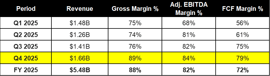● Q4: Despite having an interest payment, the sheer scale of revenue growth overpowered the cash outflow, keeping margins at an elite 79%.