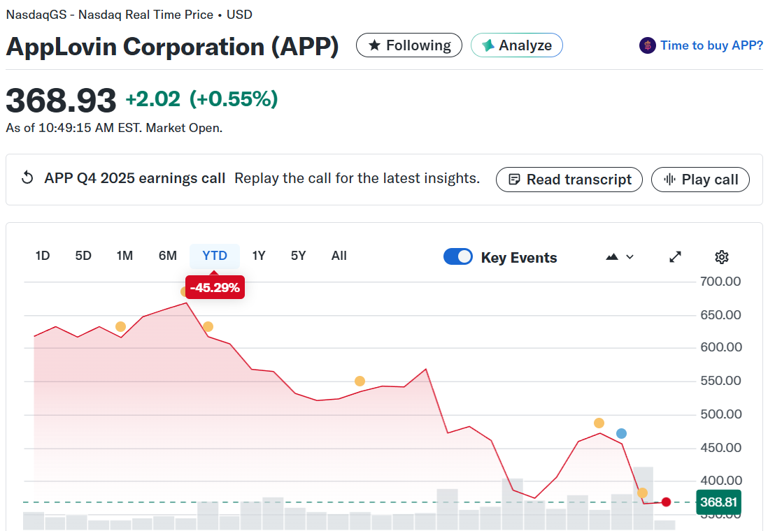 The market is currently collapsing multiples across the entire ad-tech/software landscape. As I noted in my Meta Q4 2025 Recap earlier this week, when investors cut Meta’s multiple, they take AppLovin down with it.