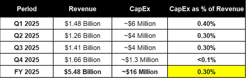 Here is a double click on the detail for AppLovin—now that we have all four quarters. You can see the capital efficiency scaling in real-time. By Q4, CapEx was effectively a rounding error (<0.1%) against $1.66B in revenue.