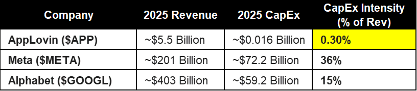 While Big Tech is incinerating cash to build the AI infrastructure, AppLovin is simply riding the rails. I did the math on 2025 CapEx Intensity (CapEx / Revenue) to illustrate just how different these business models are: