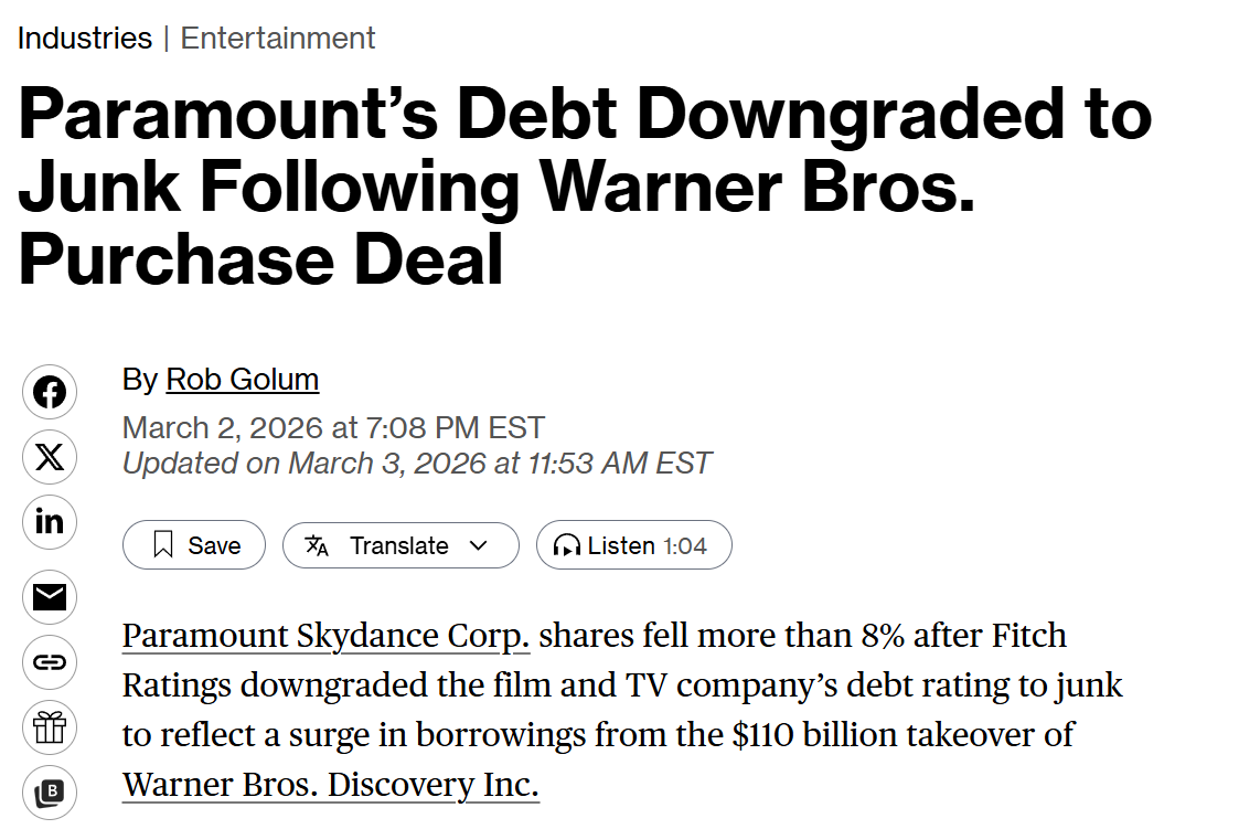 The $79 Billion Reality: Between WBD’s roughly $29 billion in debt, Paramount’s $12 billion, and $38 billion in new transaction debt, this new Frankenstein media conglomerate is staring down a $79 billion balance sheet nightmare.