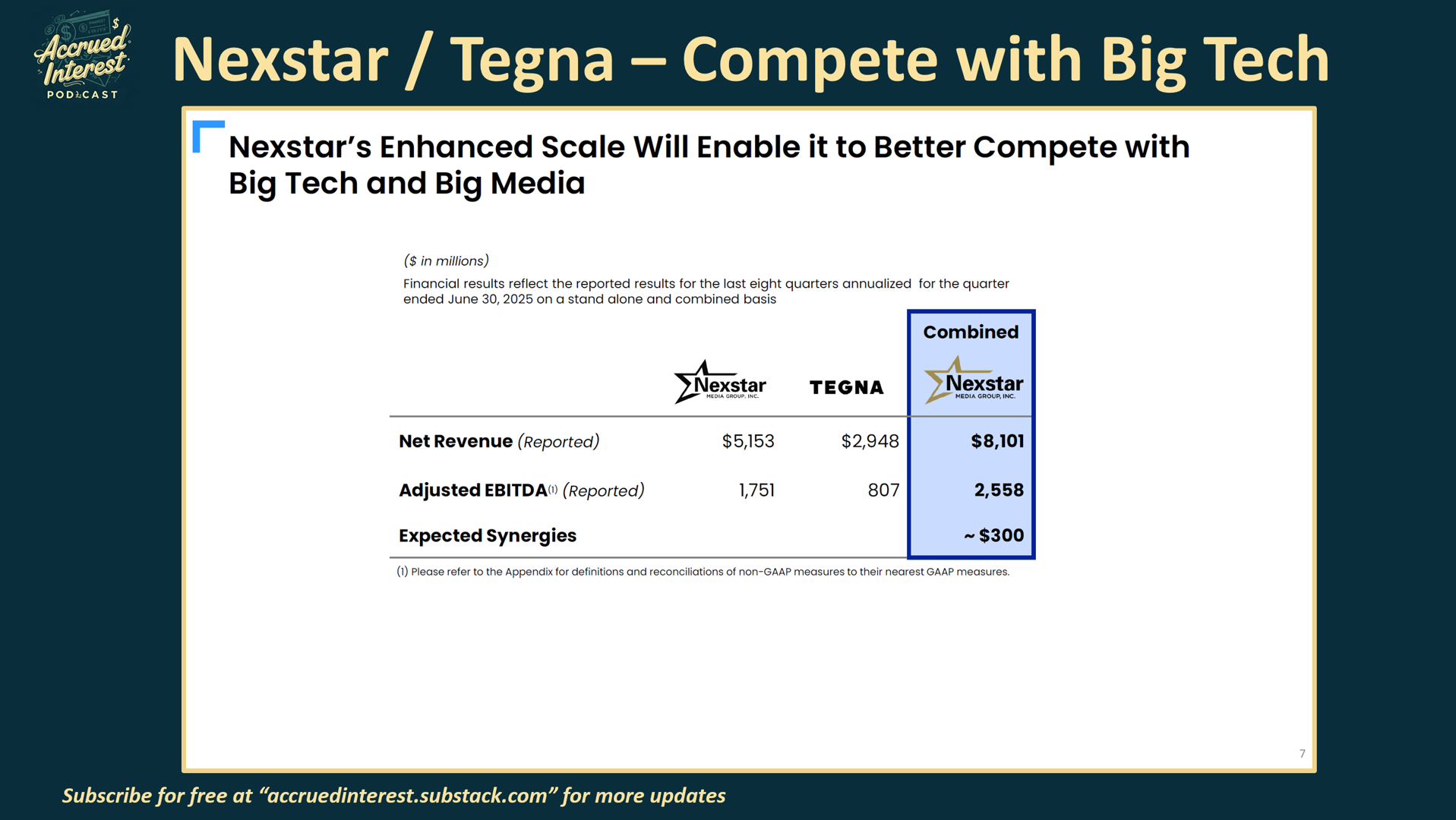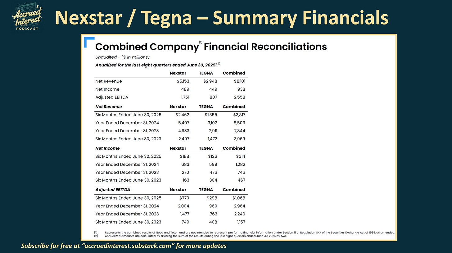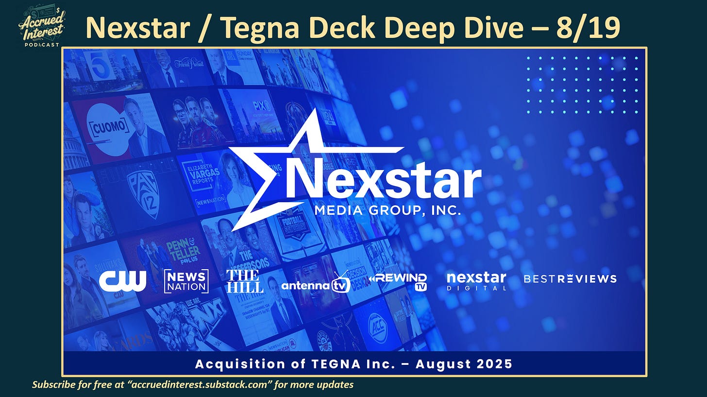 Nexstar ($NXST) dropped a new investor presentation when they held an update call on Aug 19th with official announcement that they were acquiring Tegna ($TGNA). Similar to what I did last time NXST put out an investor deck, I wanted to give you my annotated notes. Keep in mind, that there are many different audiences for an M&A announcement – not just the public shareholders. Let me help you read between the lines, as someone who used to make these decks from scratch.