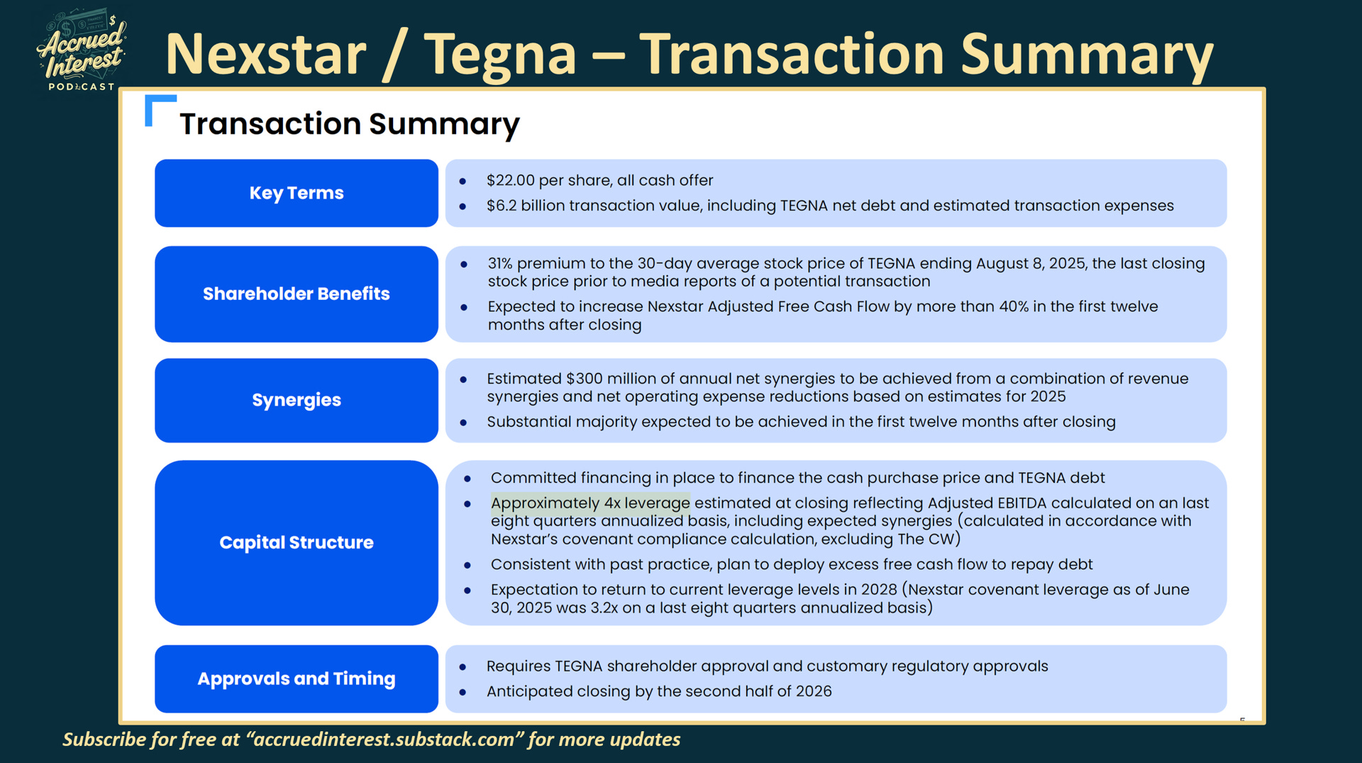 My first reaction was to ask myself - why is NXST doing an all-cash deal for Tegna? If the deal is so accretive, why can't Tegna shareholders take some equity and help have a stronger company with less debt post-close?
