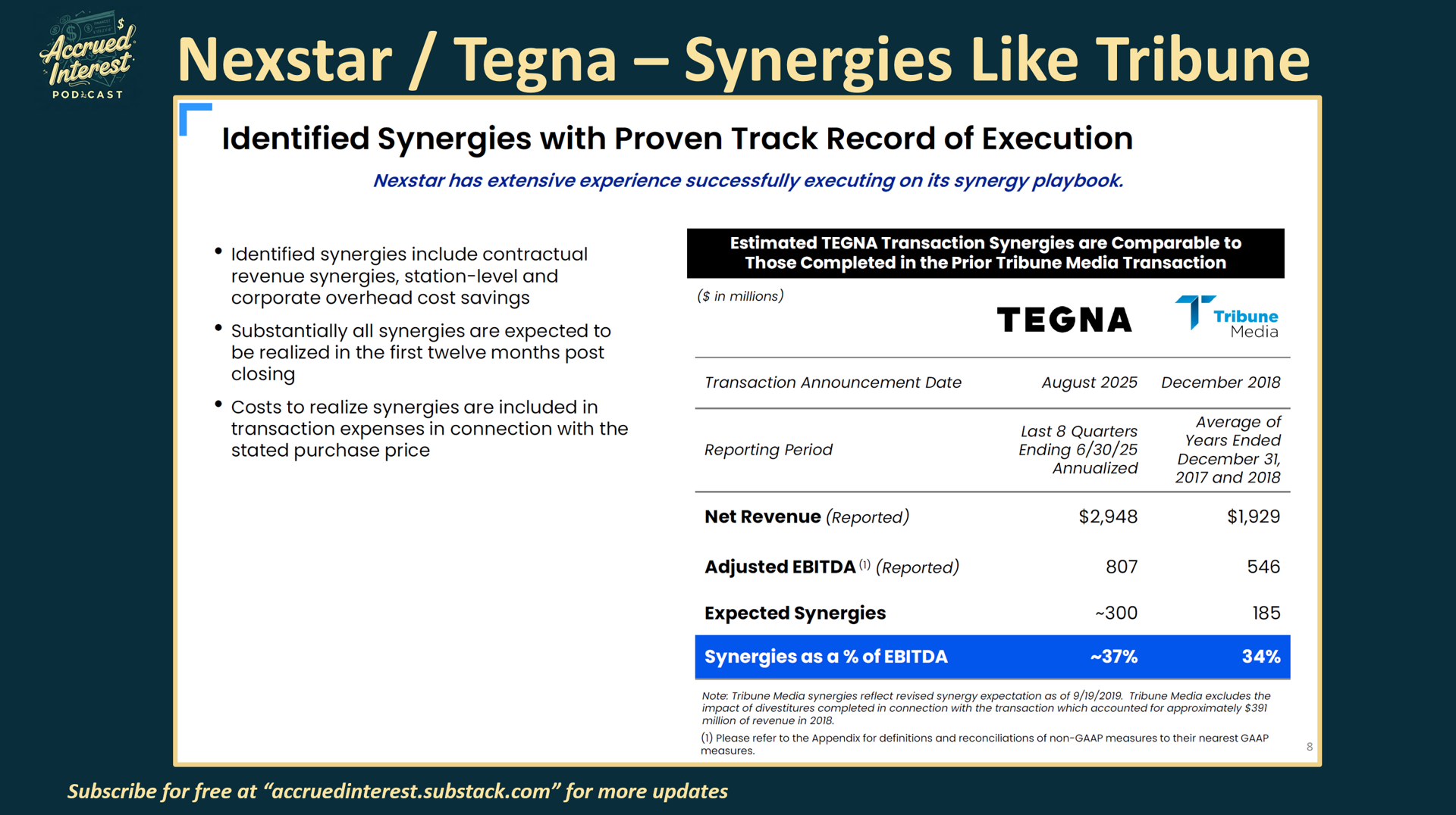 Here Nexstar finally shows us expected synergies with Tegna and the total is $300M or about 37% of Tegna's current EBITDA.