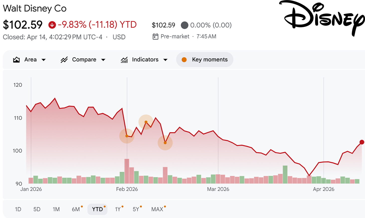 I have been structurally bearish on Disney in my past Accrued Interest writings. Back in December, during my 12 Days of Pitch-Mas series, I explicitly stated that Disney would underperform the broader market until they finally made the tough choice to cleave off and separate their linear TV assets and ESPN from the rest of the enterprise. Through April 15th, with the stock trading at $102 per share, Disney is down -10% year-to-date and is heavily trailing the S&P 500. The stock currently trades at approximately 17.5x 2026 GAAP EPS and about 16x 2027 earnings. I fully expect this underperformance to continue until management makes much larger strategic moves.