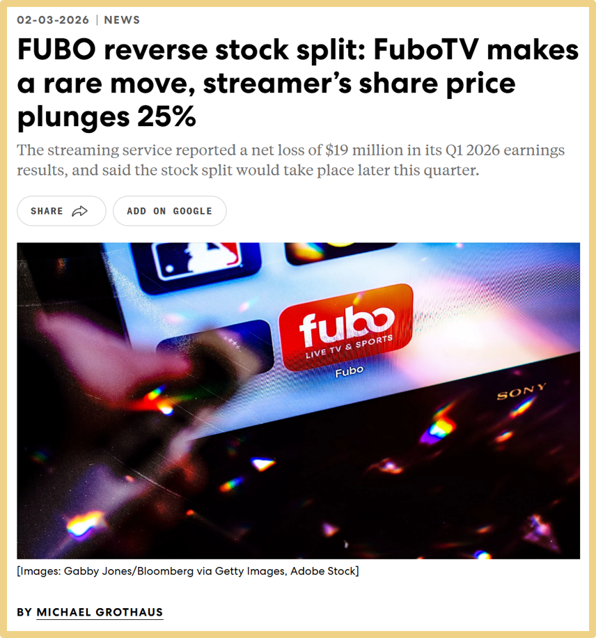When I wrote about Fubo in December, I questioned whether the company had a reason to exist in a world dominated by YouTube TV. A reverse split is often the financial equivalent of a “Hail Mary.” It creates the optical illusion of a higher share price without changing the underlying value of the business. For a company that just completed a “transformational” merger with Hulu + Live TV, resorting to financial engineering this quickly is a massive vote of no confidence in organic price appreciation.