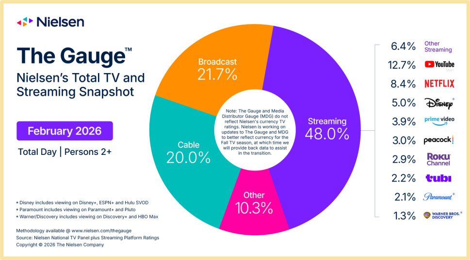 As for the actual takeaways using the old methodology, February was completely dominated by live events. Unsurprisingly, the Super Bowl and the Milan Cortina Winter Olympics were massive windfalls for NBCUniversal and Versant. The two companies combined for 13.1% of all TV viewing, officially dethroning YouTube to take the top spot on the Media Distributor Gauge. Over on the streaming side, Peacock had an astronomical month, jumping 64% in viewership to capture a record 3% share of all TV time, heavily driven by its simulcast of the Super Bowl.