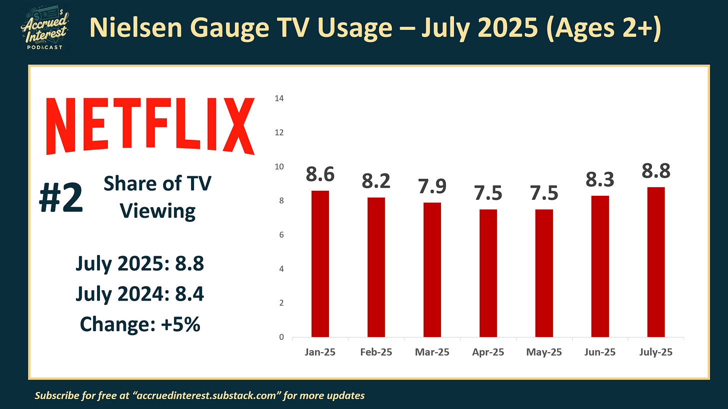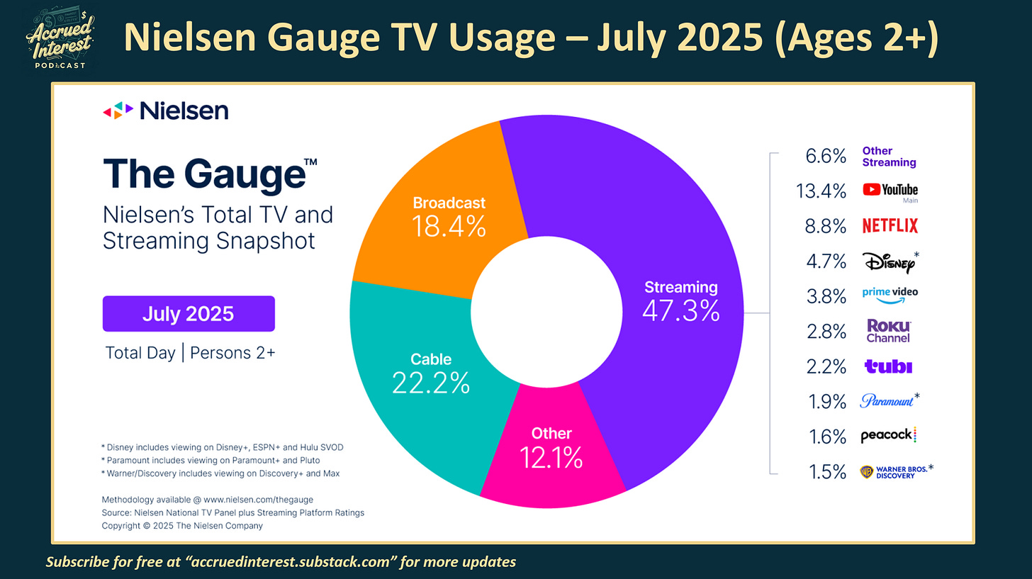 This July report largely mirrored previous trends. Streaming now accounts for 47% of TV viewership, and it's only a matter of time before it surpasses the 50% mark. I will continue to emphasize YouTube's significance, as media investors must grasp the challenge other services face in securing advertising revenue when YouTube and Netflix dominate consumers' leisure time.