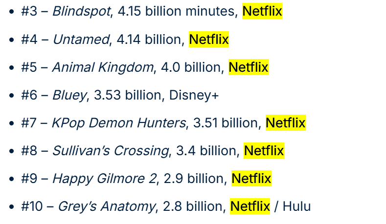 #1 Squid Games, #3 Blindspot, #4 Untamed, #5 Animal Kingdom, #7 KPop Demon Hunters, #8 Sullivan’s Crossing, #9 Happy Gilmore 2, #10 Grey’s Anatomy