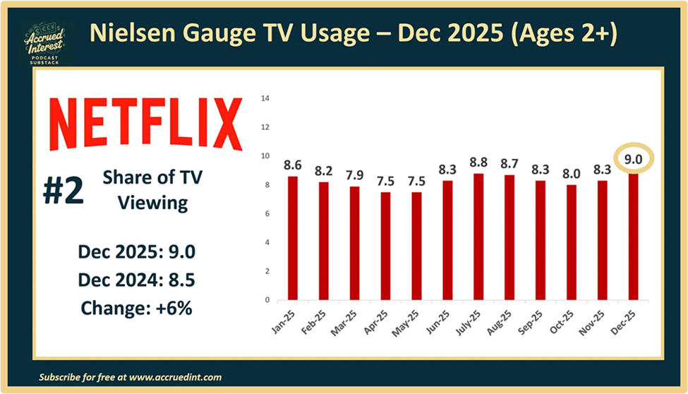 For over a year, I have been writing about Netflix’s struggle to grow its share of total TV viewing above 9%. In last monthly recap Media Stock Insights from Nielsen’s Dec-25 TV Snapshot, I highlighted how they only just reached this milestone.
