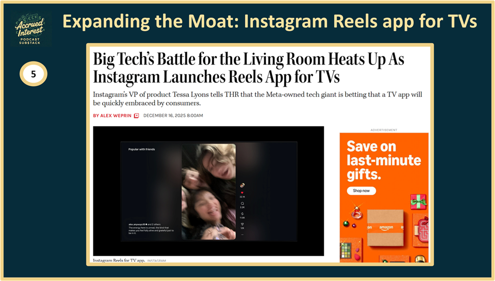 While seemingly a casual remark about competition, it was a reminder that digital behemoths like Meta are aggressively moving into the video space to capture television ad budgets. I touched on this in my 12 Days of Pitch-Mas article - Why Meta Will Outperform in 2026 ($META).