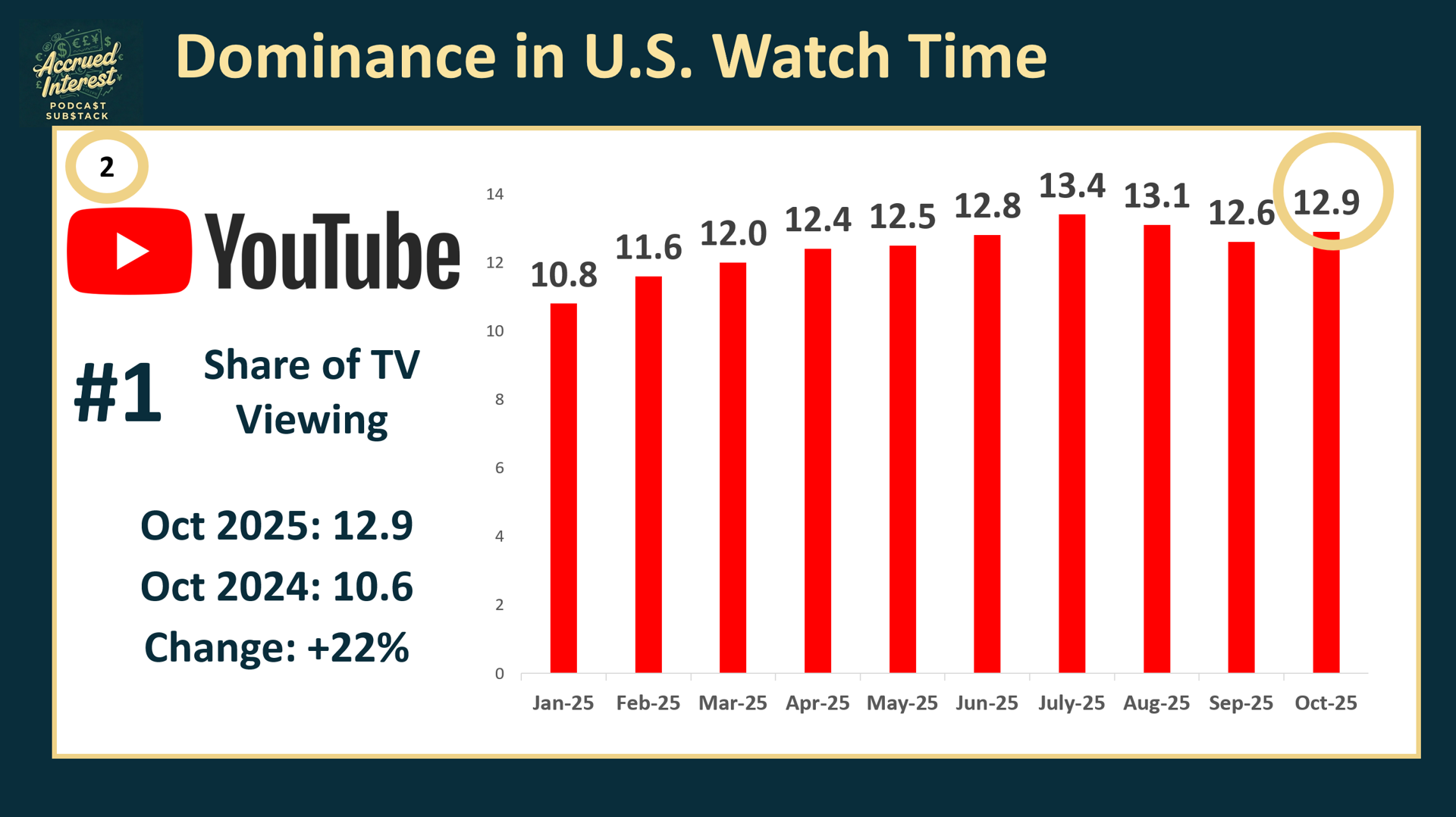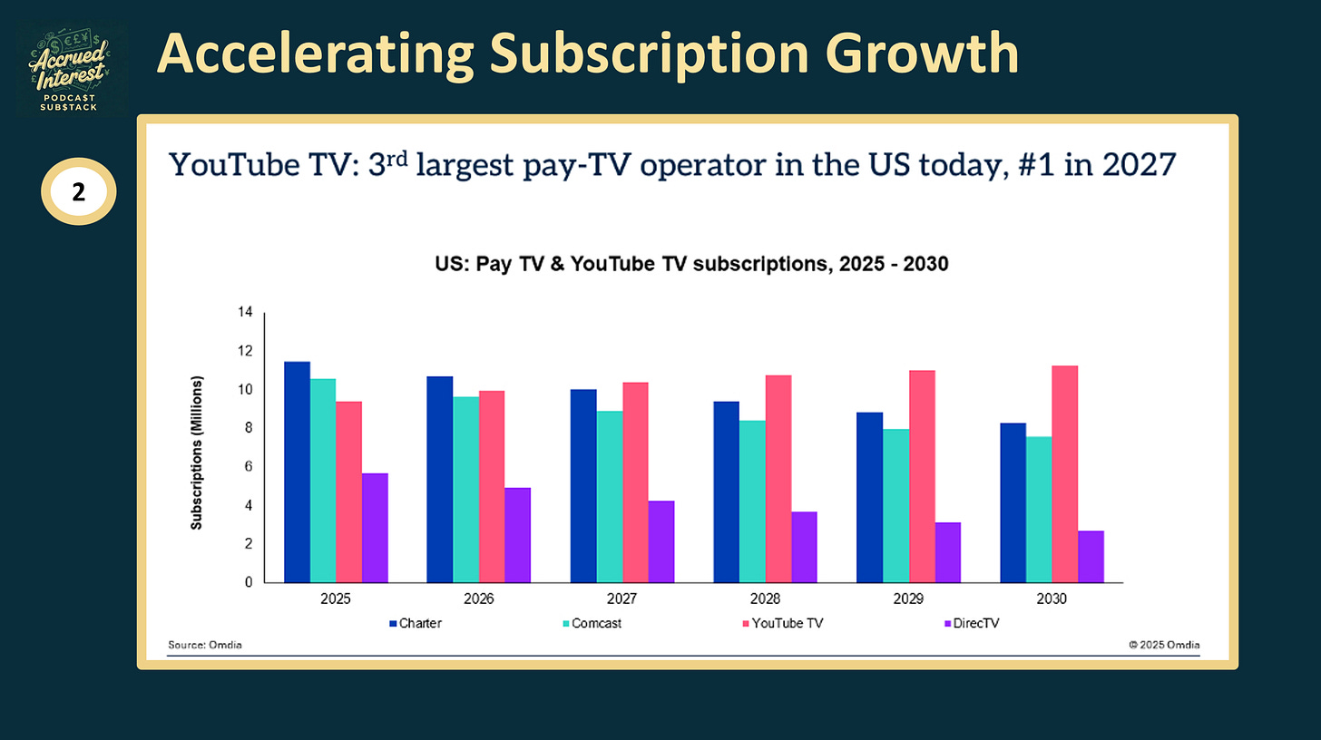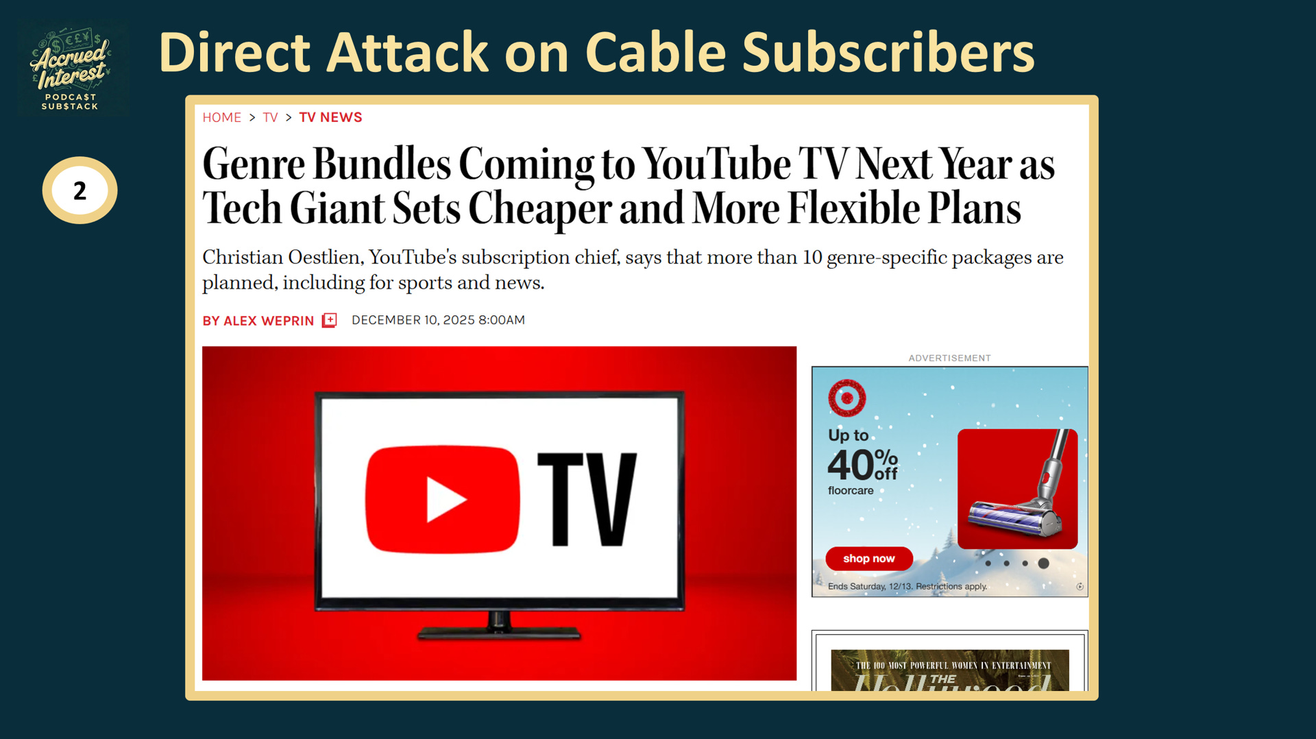 Direct Attack on Cable Subscribers: YouTube TV plans to launch genre-specific linear streaming packages (including a Sports Plan) in early 2026. This should be viewed as a “code red” for subscale competitors like Fubo, FUBO 0.00%↑ and represents a massive DIRECT attack on the lucrative subscriber fees held by legacy cable owners like Disney DIS 0.00%↑ , Comcast CMCSA 0.00%↑ , Paramount Skydance PSKY 0.00%↑ , and others.