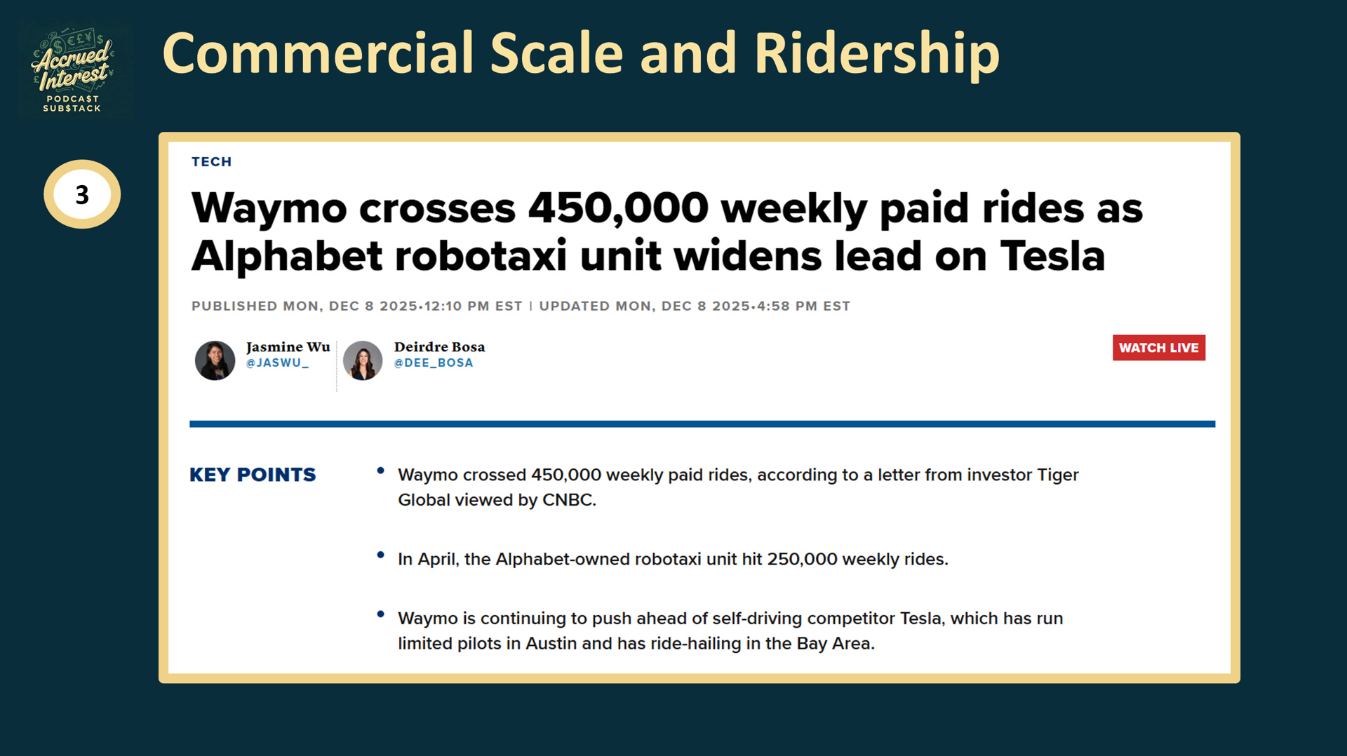 Strategic Partnerships Over Competition: Instead of engaging in unnecessary competition, Waymo is intertwining its “fates” with Uber, partnering for commercial launches in major new markets like Austin and Atlanta. This approach recognizes that the companies are “complementary services” where Uber provides the user platform and Waymo provides the autonomous technology, allowing both to avoid the capital-intensive business of fleet management.