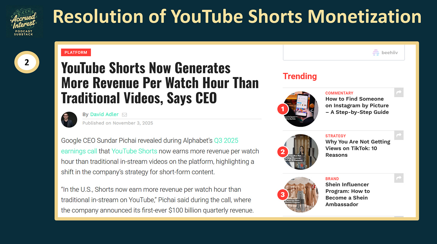 Resolution of Shorts Monetization: Early investor concerns that Shorts (YouTube’s short-form video offering) would cannibalize revenue are dissipating. Google reports that Shorts in the U.S. now earn at least much revenue per watch hour, and arguably more, than traditional in-stream YouTube content, demonstrating that Shorts will “not dilute earnings”.