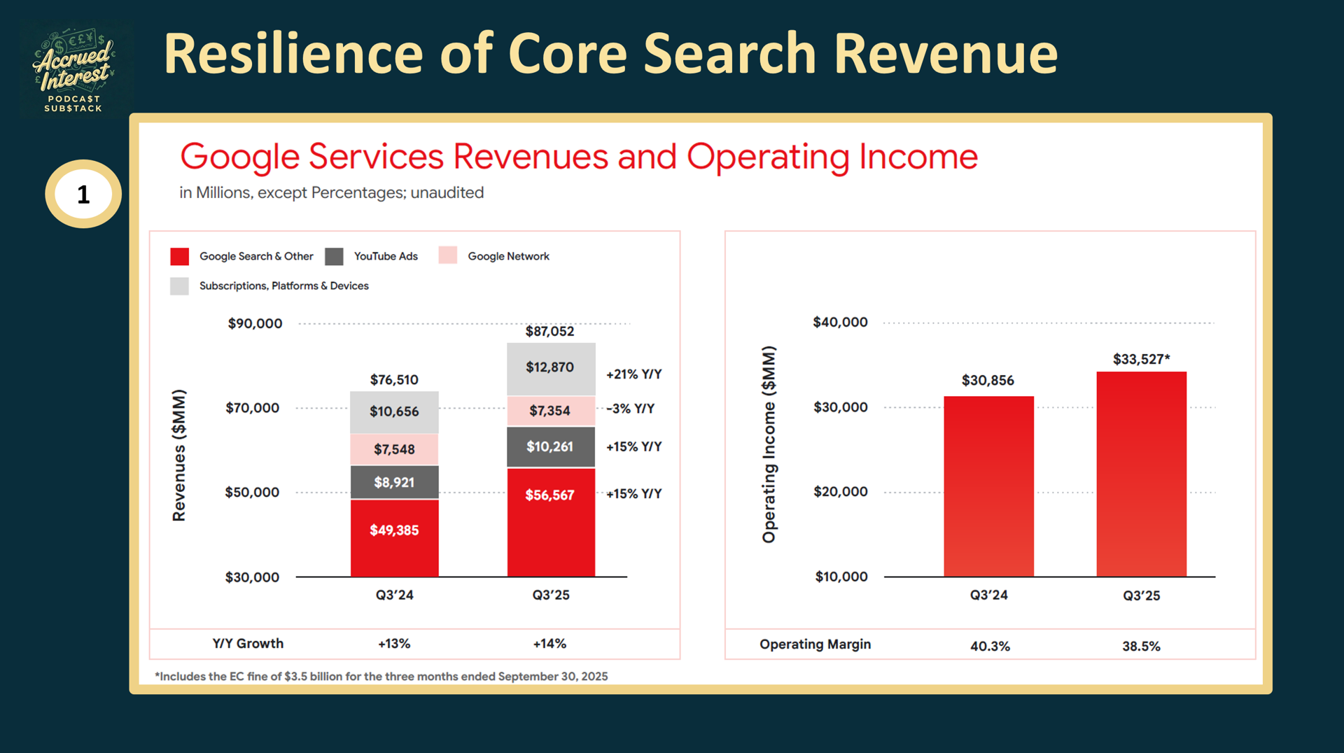 Resilience of Core Search Revenue: Contrary to fears of a “melting ice cube,” Search revenue growth has not been decelerating, growing +15% YoY for Q3-2025, maintaining its status as a robust core business. Google Search & Other revenue reached $56.6 billion in Q3 2025. It is incredibly impressive for GOOGL 0.00%↑ to be able to grow at a double digit rate from such a large revenue base.