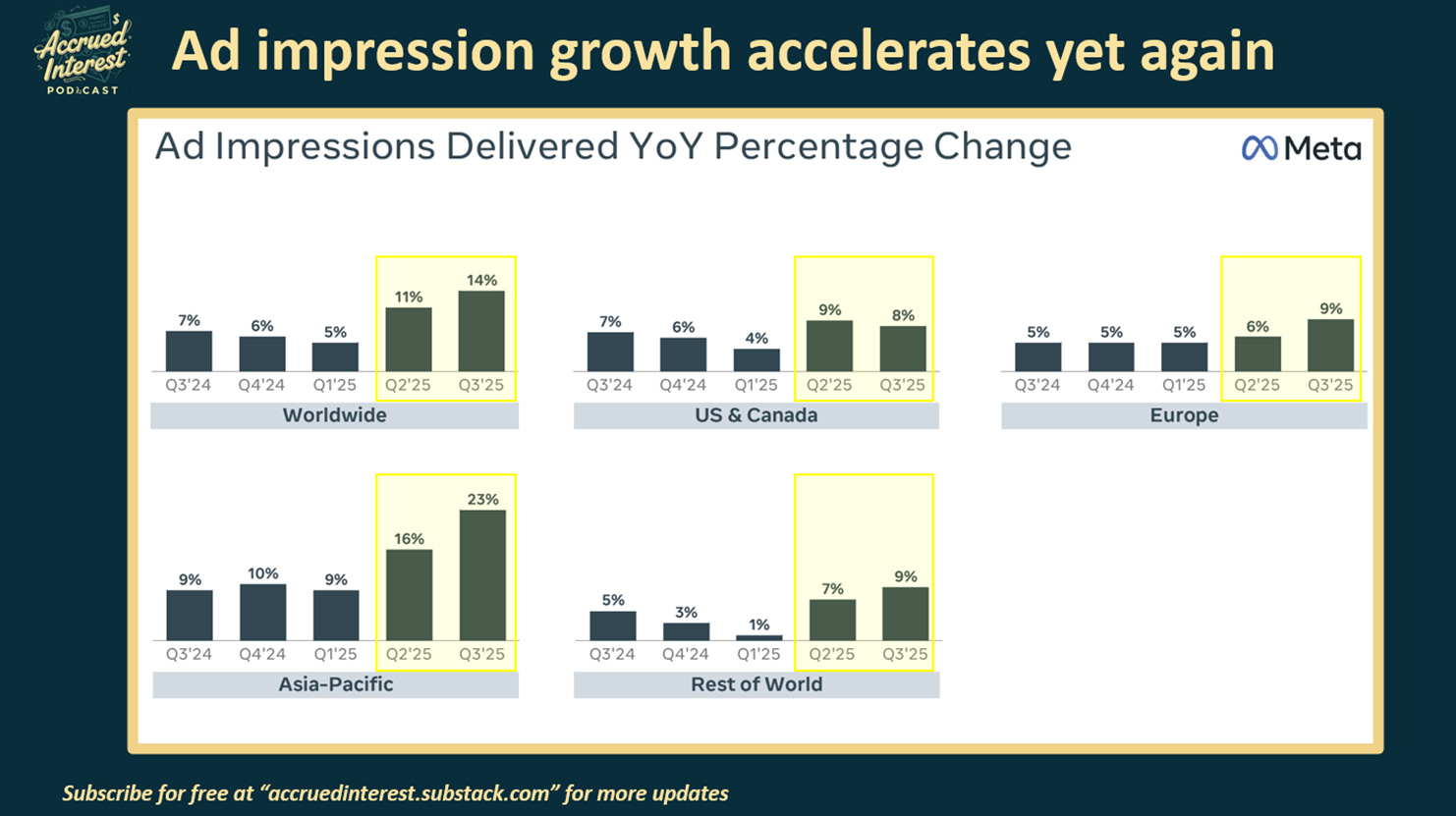 I disagree with the market’s concern that the substantial capital expenditure in AI will not yield concrete results. As I highlighted last week using Meta’s Q3 earnings report KPIs, the acceleration of advertising impression growth to +14% YoY demonstrates that AI is enhancing the matching algorithm.