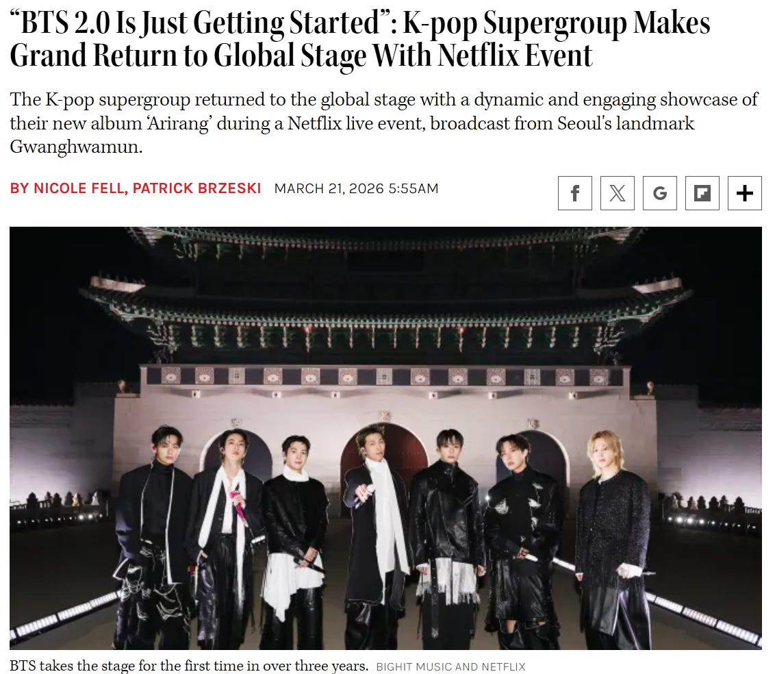 We just saw the ultimate proof of this impeccable execution. Last weekend, Netflix exclusively livestreamed the BTS Comeback concert. While legacy streamers regularly struggle with app crashes, latency issues, and buffering during live events, Netflix seamlessly broadcasted the world’s biggest pop group live from Seoul to 190 countries, instantly hitting #1 in 77 of them. Legacy media is playing a localized game with borrowed money. Netflix is playing a global game with massive operating leverage.