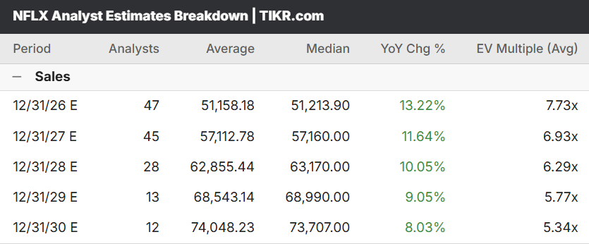 Looking at the latest Street consensus estimates via TIKR, the analyst modeling is highly reasonable and, if anything, slightly pessimistic. The Street is forecasting median Sales of roughly $51.2 billion for 2026, representing YoY growth of 13.2%. They then project a steady, gentle deceleration down to 11.6% growth in 2027 and 10% in 2028.