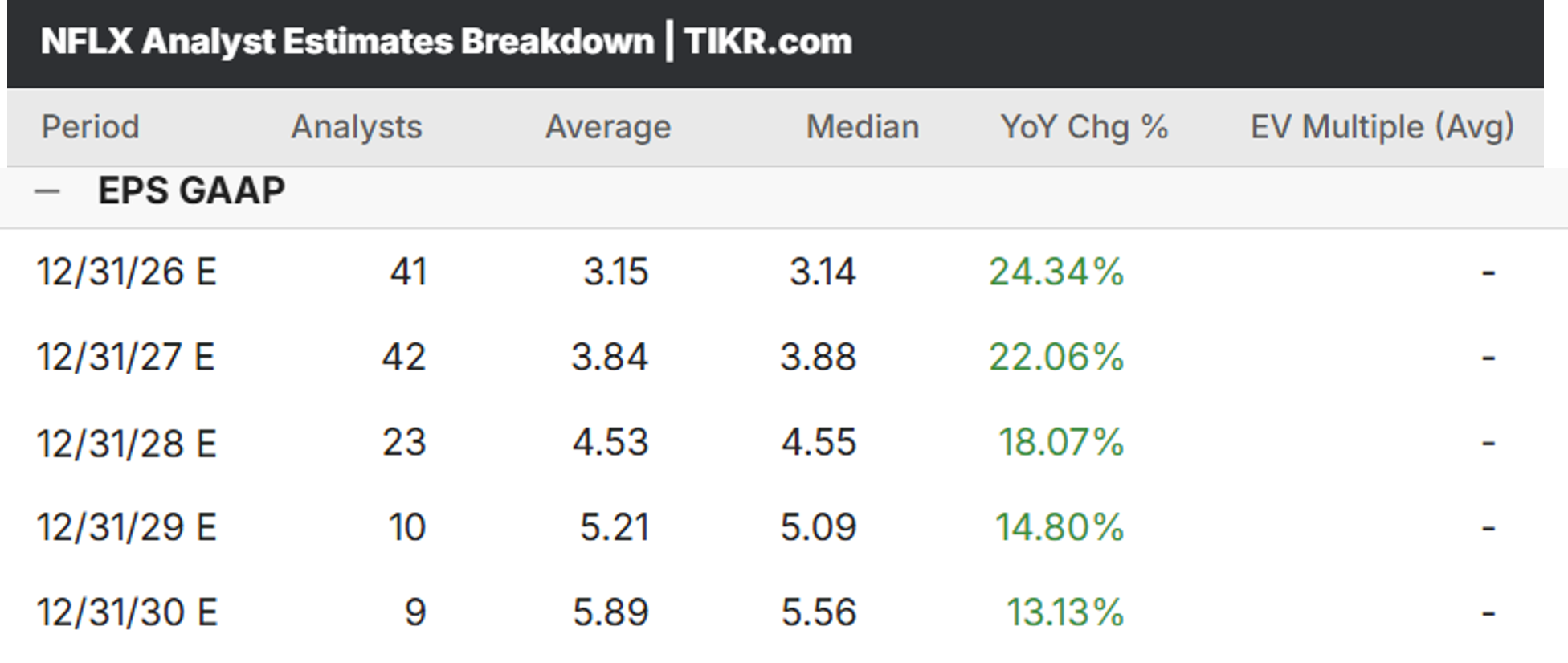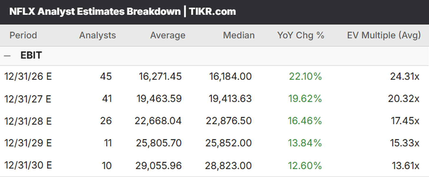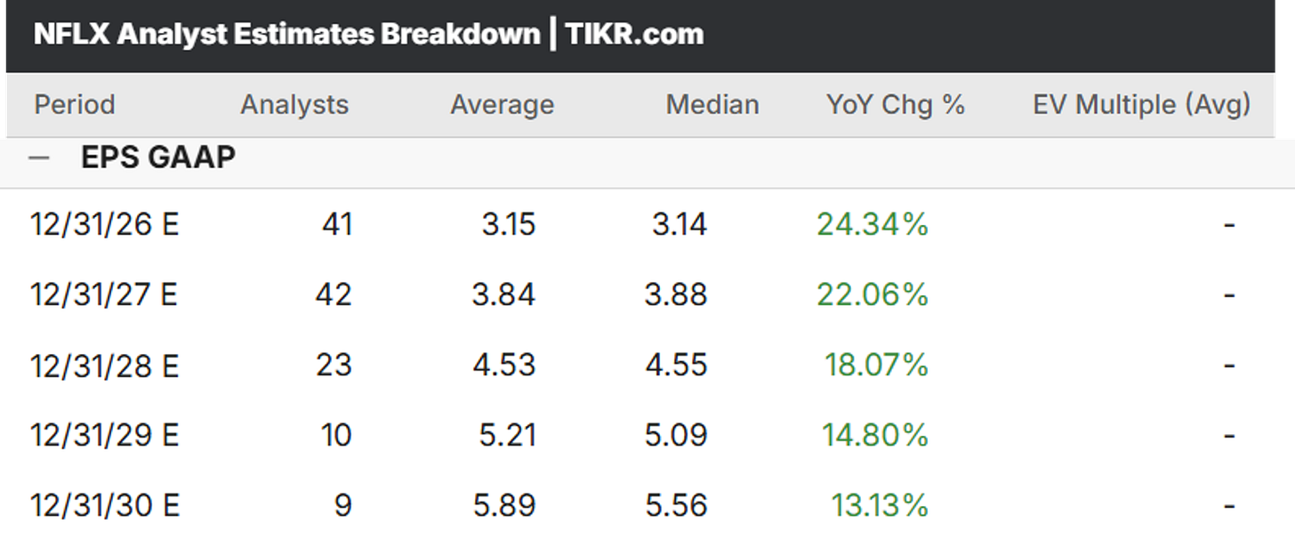 I have high conviction that Netflix will easily meet or beat their future earnings estimates, so I am willing to take on the risk of the stock today to buy it at a discount to its 2027 and 2028 earnings power.