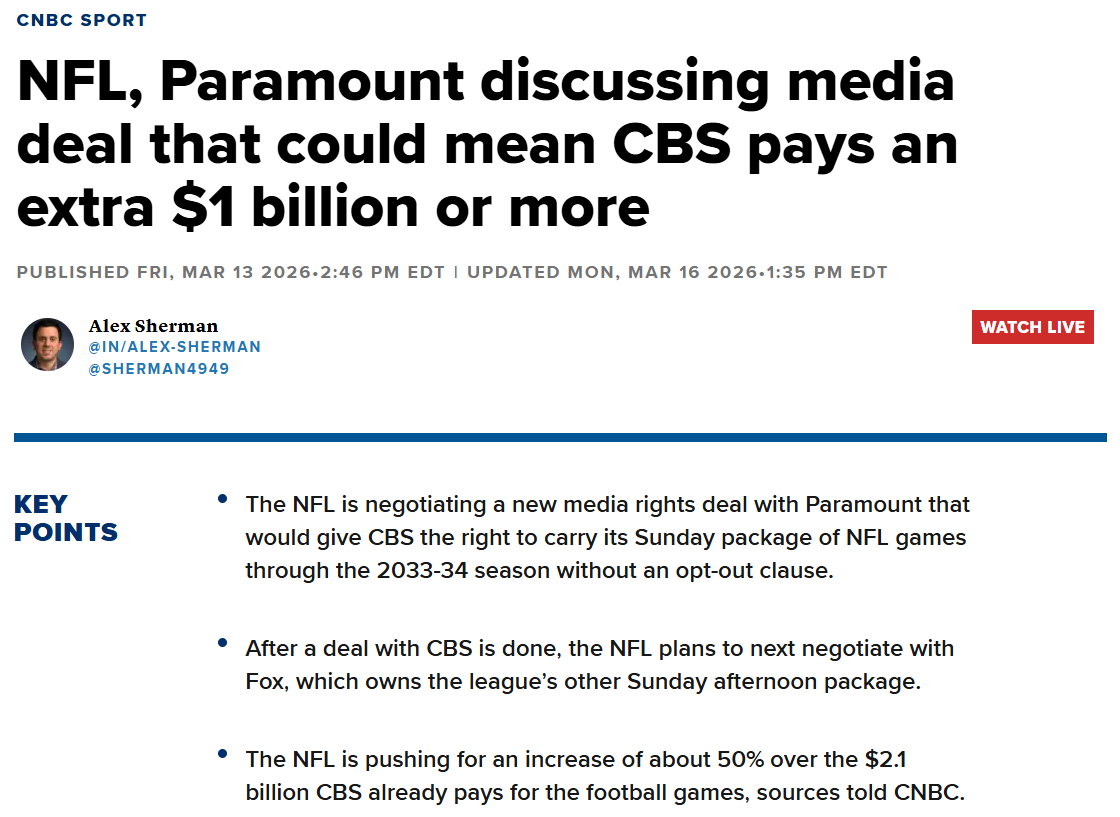 Right now, the NFL is reportedly pressuring Paramount’s CBS to eliminate their 2029-30 opt-out clause. In exchange for extending the deal, the league is demanding a 50% fee increase. That means CBS is looking at an additional $1 billion per year—pushing their annual payment to over $3 billion—just to keep the exact same Sunday afternoon package they already have. Legacy networks are effectively being held hostage. They have to pay margin-crushing premiums just to maintain their existing viewership baselines.