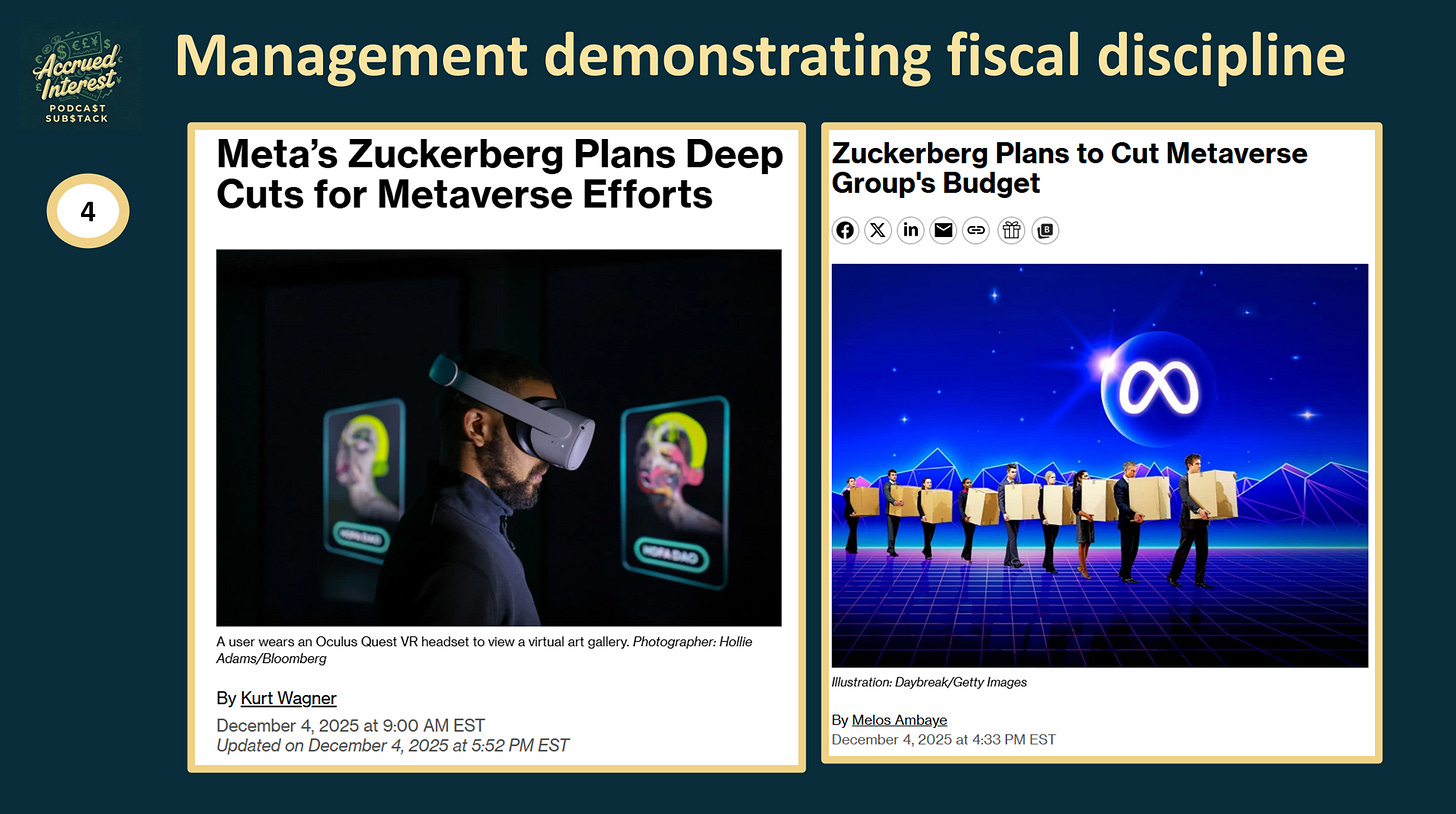 -30% operational expense cuts in the massively loss-making Reality Labs segment. For context, the division has lost over $70 billion since 2021, so these cuts are long overdue.This smart, disciplined approach pulls resources out of speculative metaverse bets and redirects them to other hardware initiatives, such as AI glasses and wearables, where they’ve got real momentum.
