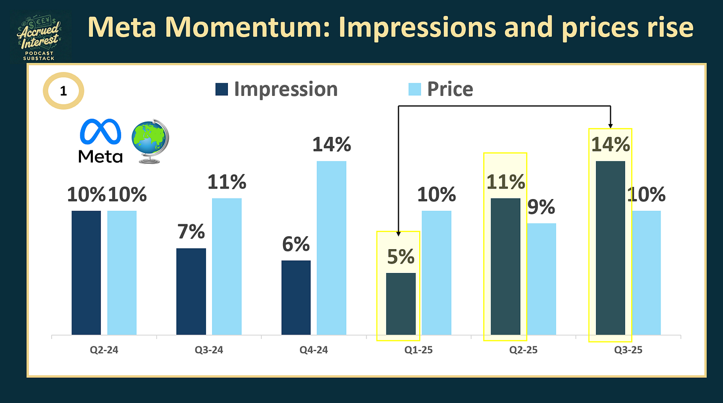 AI engine is accelerating, more users, more impressions. In Q3 2025, Meta impressively expanded ad supply (+14% impressions) while simultaneously increasing ad prices (+10%), overcoming the typical inverse relationship in auction markets.