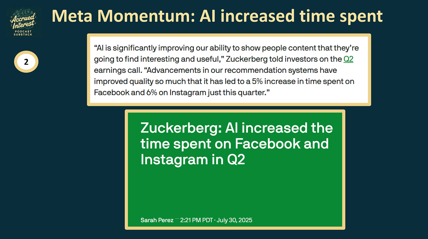 Improved relevance is boosting engagement and volume: AI systems are making content more relevant, driving increased time spent, up +5% on Facebook and 6% on Instagram in Q2 2025.