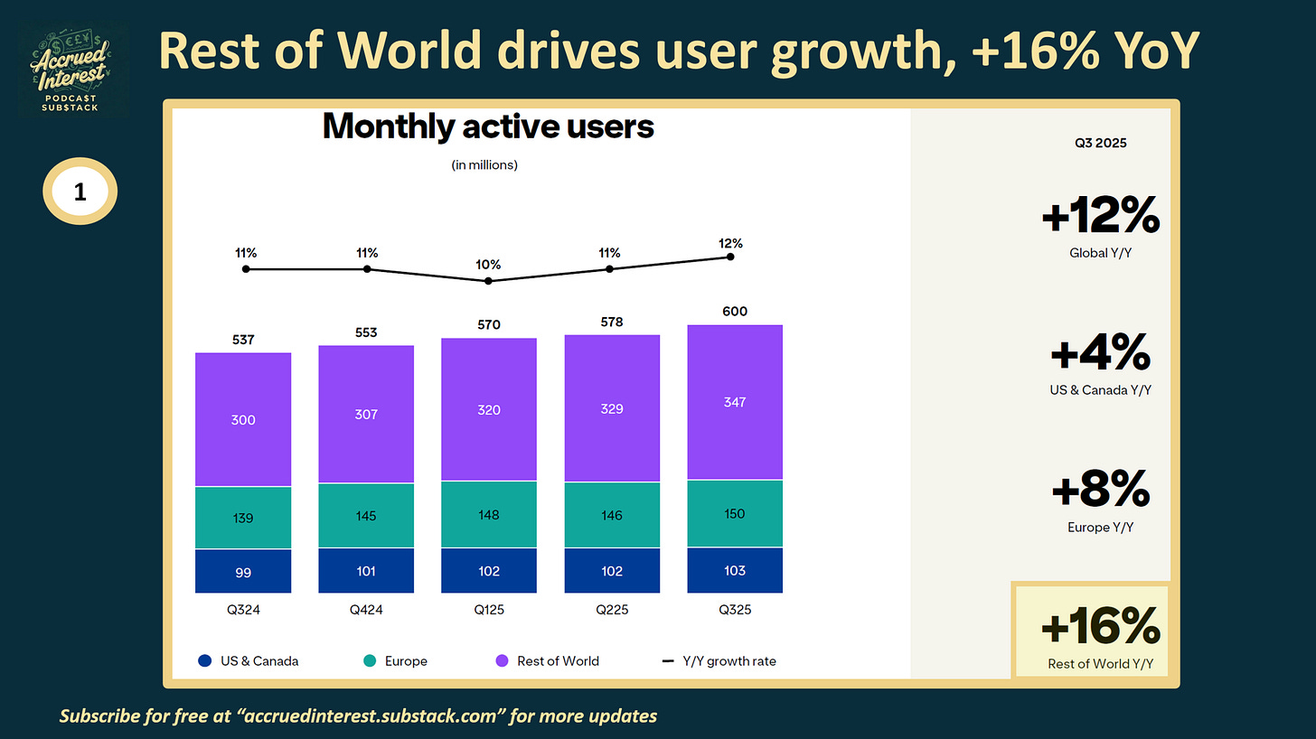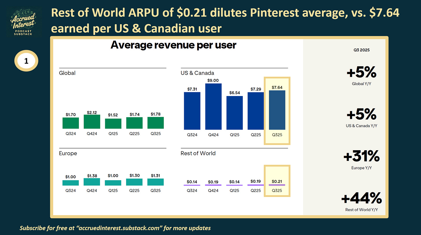 The “Rest of World” Dilution: Pinterest’s user base is growing fastest in regions where they make pennies on the dollar. In Q3-2025, Rest of World (ROW) users grew +16% YoY to 347 million, making up nearly 60% of the total user base.