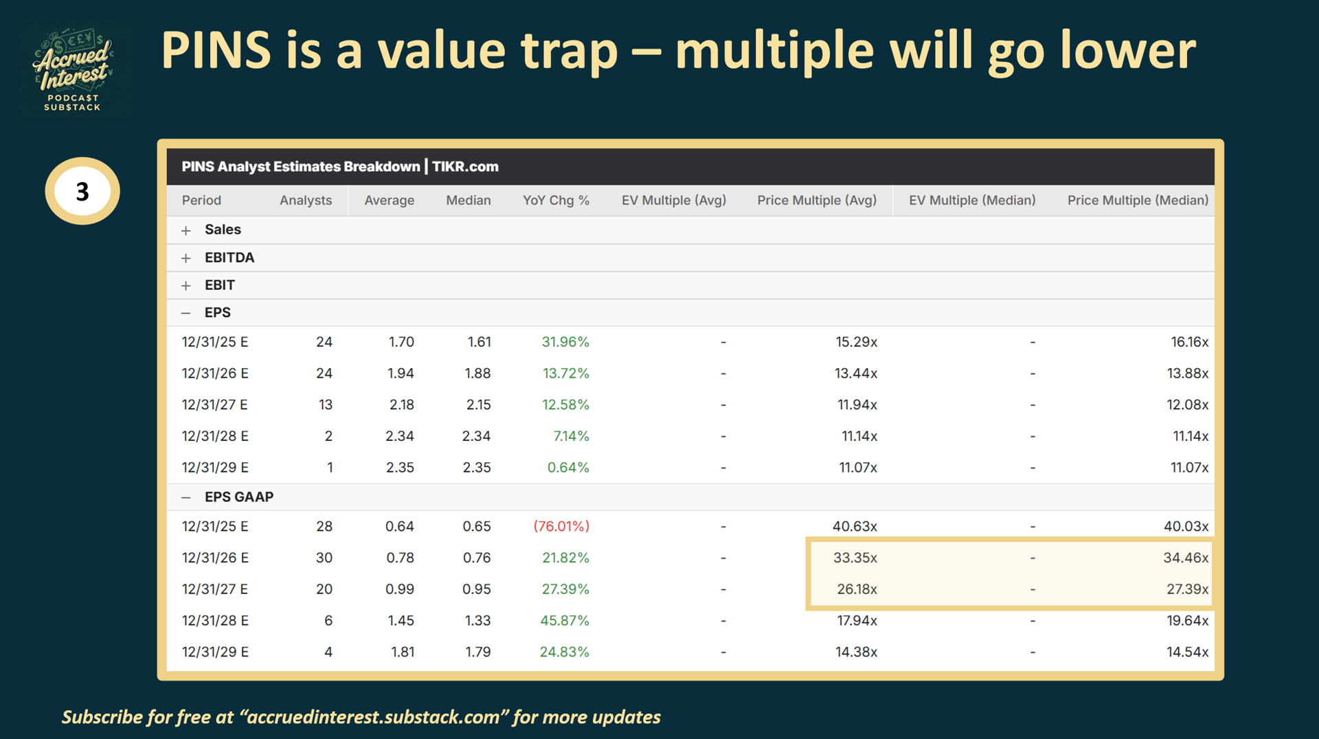 PINS stock, PINS 0.00%↑ is currently $26 per share. Bulls will tell you the stock is cheap on an adjusted basis, trading at 14x 2026 non-GAAP EPS. But low multiples on a structurally challenged business are the classic signature of a value trap.